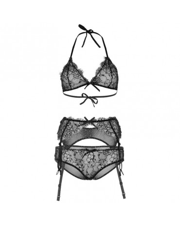 Scopri il set completo di lingerie in 3 pezzi firmato Leg Avenue, composto da un top reggiseno con strass e pizzo a effetto ciglia, uno slip con schiena interamente coperta e un reggicalze in pizzo smerlato coordinato. Un capo raffinato che esalta la tua femminilità con un mix irresistibile di seduzione, sensualità ed eleganza.
