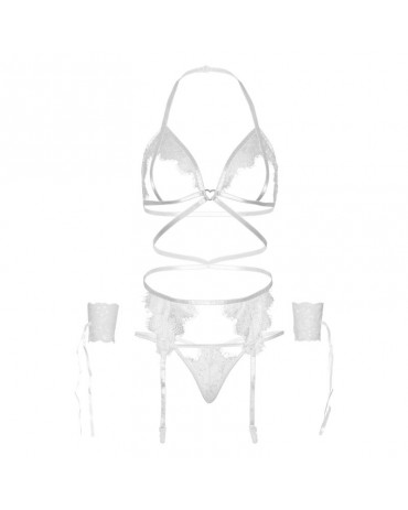 LEG AVENUE - SET QUATTRO PEZZI REGGISENO, G-STRING, REGGISTREE E POLSINI TAGLIA UNICA - BIANCO