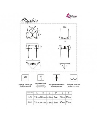 Il set comprende un reggiseno, mutandine e un reggicalze, perfetti sia per chi ha una silhouette snella sia per chi ha forme più morbide. Il taglio di questo completo è studiato per camuffare delicatamente eventuali imperfezioni su fianchi e pancia. Il reggiseno conquista con le sue spalline originali e il pizzo seducente, mentre i ferretti sollevano e modellano il seno in modo impeccabile. Le mutandine, invece, valorizzano la forma dei fianchi e stimolano i sensi grazie a ritagli discreti ma sensuali. Realizzato in pizzo morbido e flessibile, il materiale è piacevole al tatto, elastico e si adatta perfettamente al corpo senza stringere o limitare i movimenti, garantendo massimo comfort e libertà. Il nero, colore universale, si abbina bene a qualsiasi tonalità di pelle ed è adatto a ogni occasione.