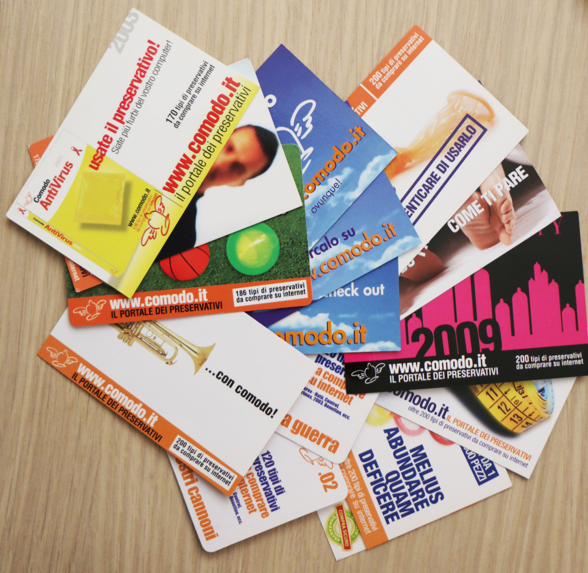L’ultimo esperimento creativo risale al 2013, quando Comodo.it, consapevole che l’ignoranza sulle malattie sessualmente trasmissibili sta iniziando a giocare scherzi seri anche agli italiani, decide di popolare il suo calendarietto di figurine in festa. Le silhouette che brindano attorno al tavolo del sesso libero si chiamano Candida, Clamidia, Herpes, Papilloma, Hiv e via dicendo. Un solo profilattico – questo il messaggio – basta a rovinare il ricevimento a tutte, senza rischi e complicazioni di alcun genere. Questa volta il motto è implicito: no condom, no party!