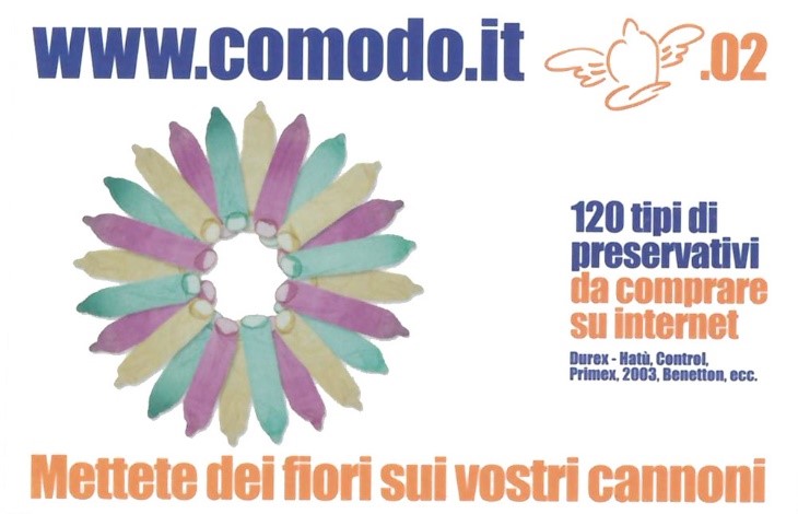 Mai come quell’anno, insomma, i motti di Comodo.it si sarebbero rivelati profetici, poiché accompagnati da due immagini iconiche. Nel primo una serie di condom distesi, a formare il simbolo della pace, nel secondo gli stessi condom disposti a fiore. Entrambi preannunciavano quella campagna nazionale, nominata come “Pace da tutti i balconi”, che avrebbe portato, da settembre 2002, centinaia di migliaia di italiani ad esporre la bandiera arcobaleno su balconi e davanzali per dire no alla guerra preventiva all’Iraq.