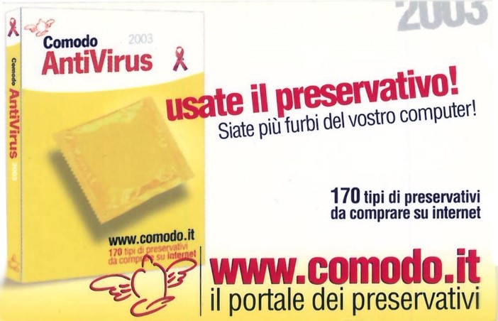 Manco a farlo apposta con il 2003 si avverò un’altra profezia. Per quell’anno Comodo aveva scelto di ironizzare sul tema degli antivirus con un motto di estrema simpatia: “Siate più furbi dei vostri computer, usate il preservativo”. Ed è così che, a pochi giorni dalla distribuzione degli omaggi annuali, si verificano due attacchi internet globali che potrebbero essere tranquillamente definiti come i più estesi e rilevanti nell’intera storia della rete delle reti: l’Internet worm Slammer che il 25 gennaio del 2003 e poi nuovamente ad agosto, nel giro di pochi minuti riuscì ad infettare centinaia di migliaia di computer in tutto il mondo, aumentando il traffico di rete al punto che vari segmenti nazionali di Internet andarono letteralmente in crash; e poi i primi Trojan, gli insidiosi programmi in grado di condurre attacchi di spam di massa contro cui oggi ancora lottiamo.