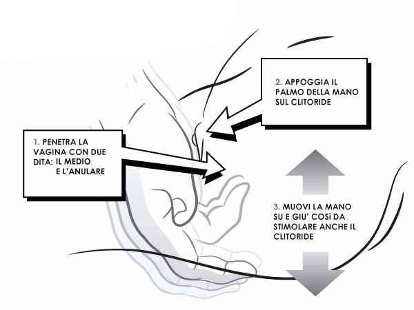 Il medio e l’anulare devono stimolare l’interno della vagina (il  situato sulla parte anteriore della vagina) in corrispondenza del punto G mentre il palmo della mano preme sul clitoride.