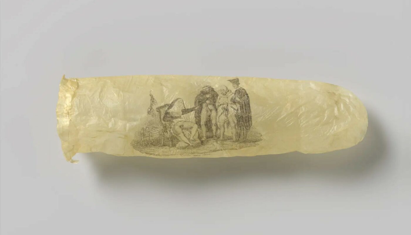 Prima dell’invenzione della gomma vulcanizzata nel 1839, i preservativi erano spesso realizzati con materiali come il lino o membrane animali, offrendo una protezione limitata. Nonostante fossero malvisti, erano venduti discretamente in bordelli e barbieri. Questo esemplare, uno dei soli due noti con decorazioni erotiche, offre uno spaccato delle attitudini verso la sessualità, la prostituzione e le malattie veneree dell’epoca.