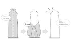 L’idea alla base di questo oggetto della moderna tecnologia è che il pene di un uomo sia un prezioso dono che egli regala alla sua amante. Il profilattico ha quindi due diversi strati: un primo che dev’essere “scartato” sbucciandolo come una banana, e un secondo, che rappresenta il preservativo vero e proprio.