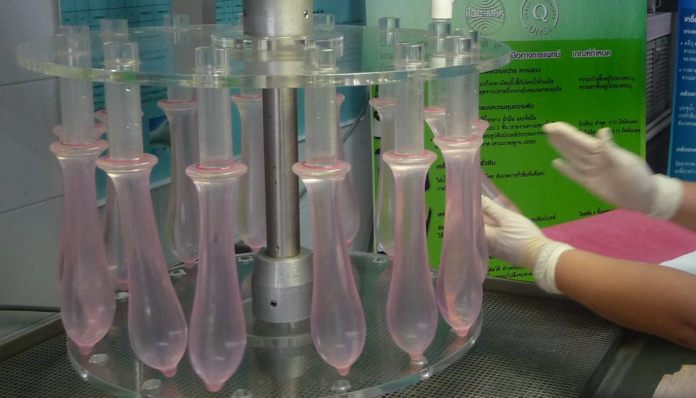 - Prova di scoppio: i profilattici sono gonfiati fino a raggiungere il punto di rottura per verificarne le doti di elasticità e resistenza alle pressioni più elevate.