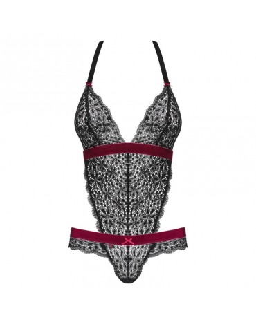 Dai seni il body prosegue coprendo l'ombelico fino al pube terminando in un perizoma in pizzo nero con un laccetto in velluto bordeaux che cinge i fianchi mettendo in risalto i glutei.