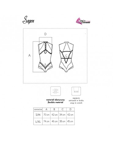 Il body Sagen è pensato per donne sicure di sé che desiderano mettere in risalto il proprio sex appeal. Realizzato in rete e pizzo trasparente, questo modello avvolge il corpo fino al collo. Presenta sensuali ritagli lungo tutta la linea dello sterno, chiusi da bottoni rivestiti in tessuto lucido. Pur coprendo il seno, attira su di esso tutta l'attenzione. Nella parte inferiore, il body in pizzo avvolge i fianchi e lascia intravedere i glutei, modellandoli con eleganza. Un dettaglio distintivo è l'ampio ritaglio sulla schiena, valorizzato da una cintura in vita.