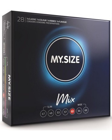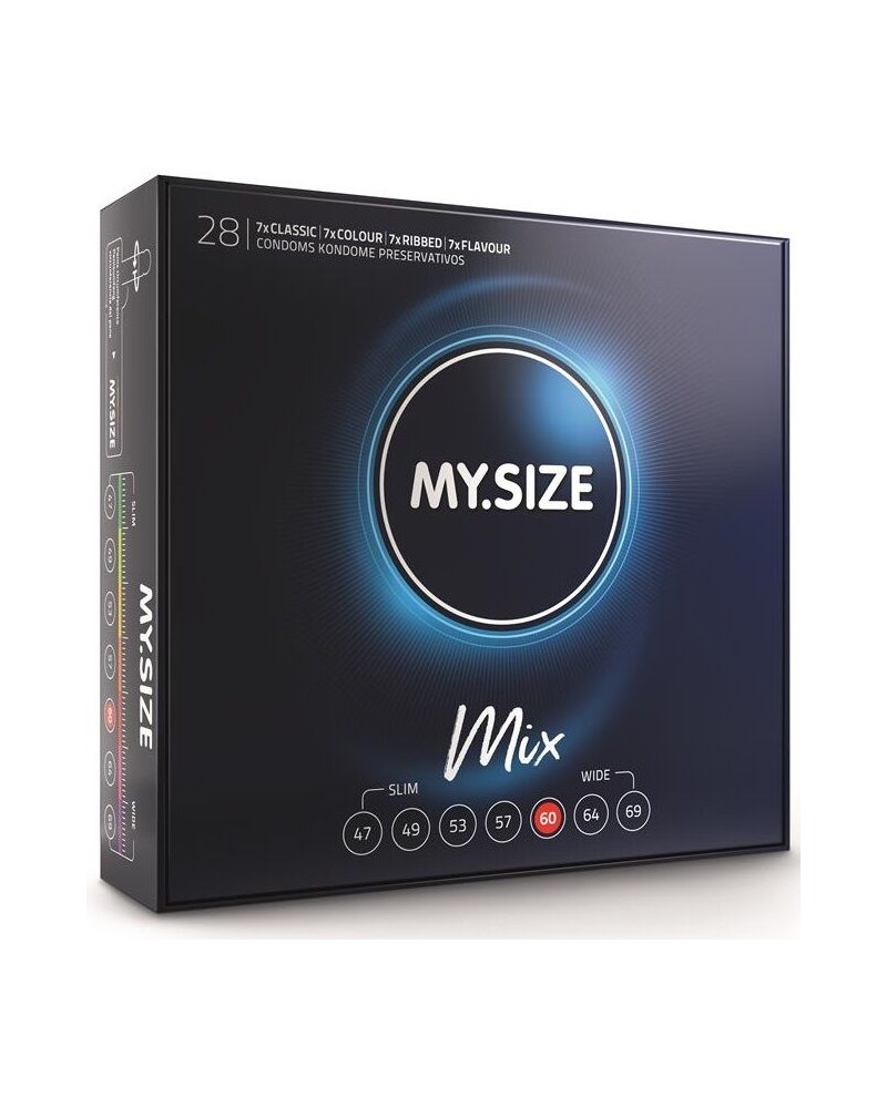 IL PACCHETTO CONVENIENTE: 28 preservativi MY.SIZE in 4 varianti - 7 Classic, 7 Ribbed, 7 Flavor, 7 Colour. Larghezza nominale 60 mm. Marcatura CE. Conforme alla Direttiva UE 93/42/CEE sui dispositivi medici. Disponibile anche in altre larghezze nominali. Include un'app gratuita per la misurazione online.