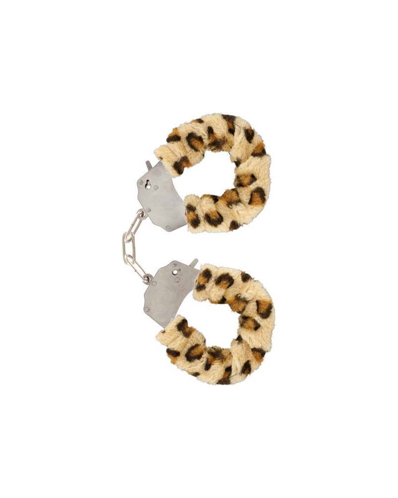 Eleganti polsini in due pezzi, collegati da una resistente catena in acciaio cromato, avvolti da un soffice rivestimento in peluche con fantasia leopardata.