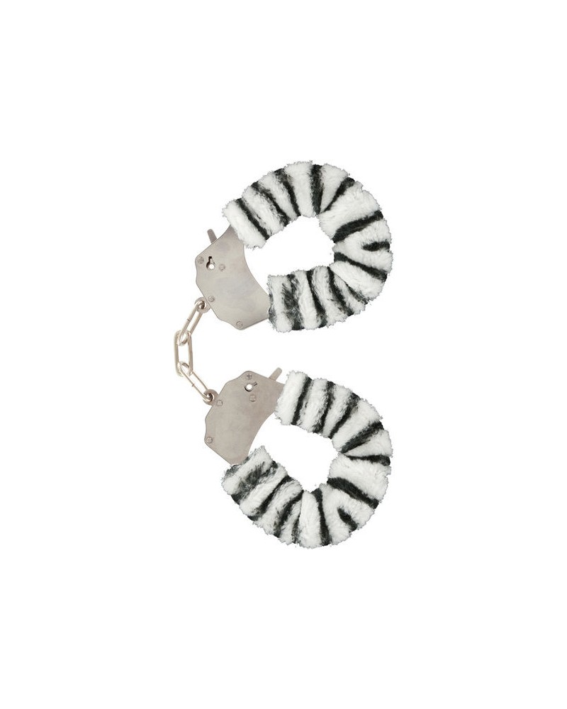 Eleganti spore bulbose da polso, composte da due pezzi uniti da una catena in acciaio cromato, avvolti da un soffice peluche che impreziosisce i polsini con un originale motivo zebrato.