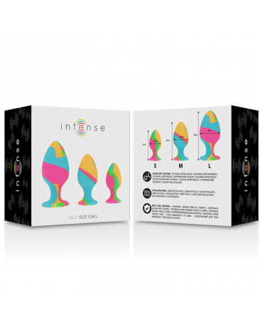 Scopri il tuo lato più audace e lasciati conquistare da un piacere fuori dal comune con i set di plug anali Intense™. Questo coraggioso set si distingue per il suo vivace design tie-dye, la sonda conica e arrotondata e la base a ventosa versatile, che rende il gioco ancora più entusiasmante. Realizzata in silicone, la sonda aumenta gradualmente di diametro, passando da 2,7 cm a 4 cm, per offrirti un’esperienza di stimolazione progressiva e soddisfacente.