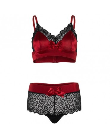 Scopri il comfort e l'eleganza di questo reggiseno in morbido spandex di raso, arricchito da delicati bordi in pizzo. Dotato di chiusura a gancetti e spalline regolabili, è abbinato a uno slip da ragazzo con tassello in cotone, firmato dal rinomato brand di lingerie Leg Avenue.