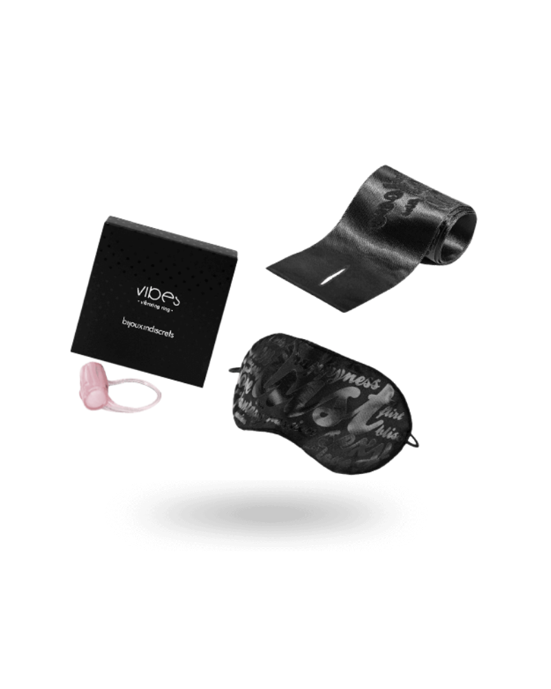 - Contenuto: Anello vibrante, manette in raso, maschera in raso.