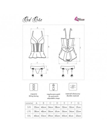 Scopri il fascino irresistibile del set Red Rose, composto da una camicia dal taglio unico e un perizoma con reggicalze. La camicia è realizzata in un tessuto finemente ricamato con motivi femminili in rosso intenso. Il retro si allunga con una linea ondulata che valorizza la silhouette. Poco più in alto, una cintura in pizzo nero impreziosita da un grande fiocco in raso completa il look. La parte posteriore della camicia si chiude come un corsetto, garantendo una vestibilità su misura che abbraccia perfettamente la figura. Le spalline, più larghe e in tonalità rosse e nere, si estendono sul busto formando una profonda scollatura a V. La camicia aderisce delicatamente alla vita, decorata con motivi verticali neri che snelliscono otticamente e mettono in risalto il profilo femminile. Il reggicalze è rifinito con fiocchi di raso di media dimensione, aggiungendo un tocco di dolcezza e sensualità.