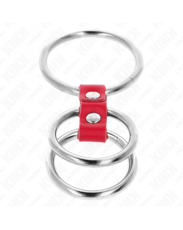 KINK - ANELLO PER PENE IN TRIPLO METALLO DA 3,7 CM A 5 CM COLLEGATO CON PELLE ROSSA
