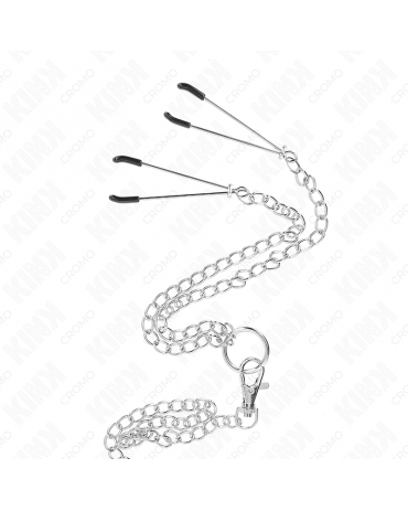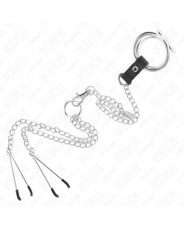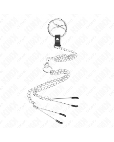 KINK - ANELLO PER PENE IN METALLO CROMATO TRIPLO DA 3,8 CM A 5 CM, CATENA IN METALLO DA 26 CM E MORSETTI PER CAPEZZOLI MOD. 2