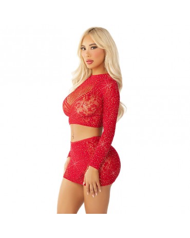 Esprimi la tua audacia con eleganza grazie al nostro completo top e gonna in rete rossa scintillante.