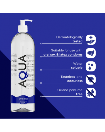 - AQUA® è perfetto anche per l'uso con i preservativi o per il contatto pelle a pelle. A differenza di molti altri lubrificanti a base d'acqua, non lascia residui. Inoltre, la sua bottiglia trasparente sarà un tocco di stile sul tuo comodino.