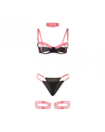 Realizzato con materiali di alta qualità (95% poliestere e 5% elastan/spandex), questo completo garantisce una texture morbida, un’ottima elasticità e un’aderenza ideale che valorizza le curve. Il reggiseno, con spalline incrociate, avvolge e mette in risalto il décolleté, mentre le trasparenze e i contrasti cromatici nei toni del rosa donano un’atmosfera romantica e sofisticata.