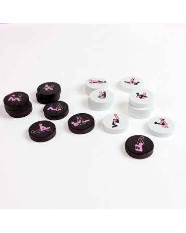 - 42 pezzi (21 bianchi e 21 neri), ognuno rappresentante una diversa posizione del Kama Sutra.