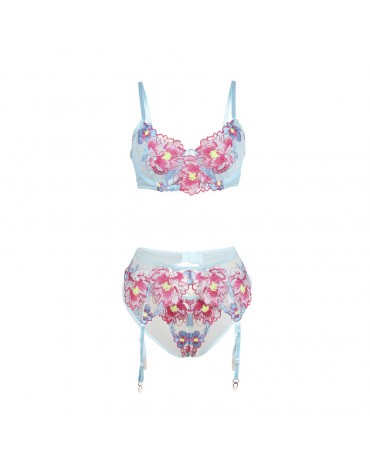 Il punto forte di questo splendido set è la maglia trasparente con motivo floreale goffrato, che unisce delicatezza e sensualità in modo armonioso. Il reggiseno, con coppe semi-trasparenti decorate da eleganti fiori in rilievo, avvolge il seno con grazia, offrendo un sostegno piacevole senza rinunciare al fascino. Le spalline regolabili e la chiusura posteriore garantiscono una calzata su misura, per massimo comfort e sostegno.