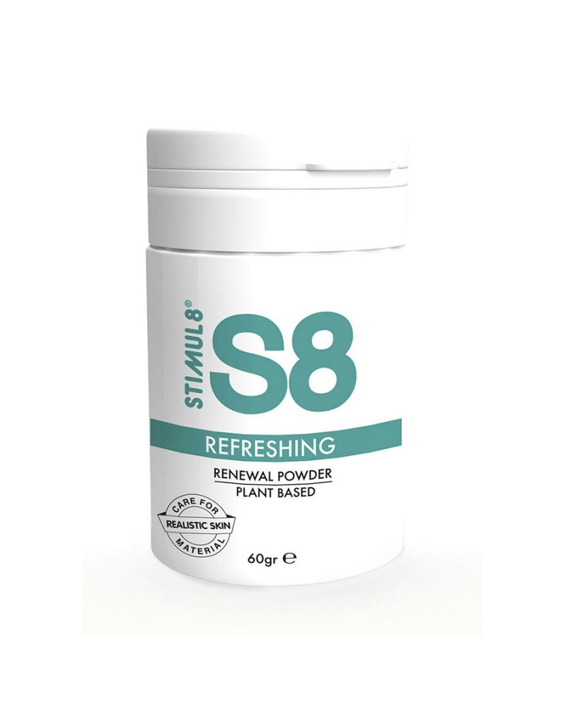 Prenditi cura dei tuoi prodotti Realistic Skin preferiti e mantienili freschi e come nuovi con la polvere S8 Renewal. Lava e asciuga il tuo giocattolo Realistic Skin. Applica una buona quantità di polvere e massaggia delicatamente fino a quando il tuo giocattolo non tornerà morbido e liscio.