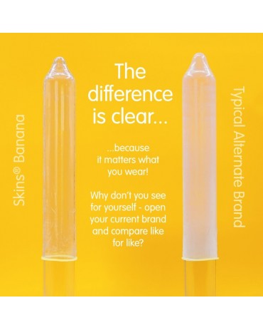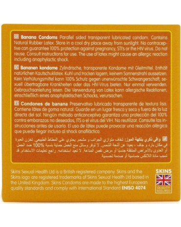 Delizia il tuo palato con la sensazione di gusto dei preservativi Skins Banana! 4 preservativi al gusto di banana, confezionati singolarmente per un facile utilizzo. Un bell39aspetto! Sentiti bene! Goditi un sesso naturalmente migliore con un preservativo che si adatta perfettamente a te. Così trasparente e sottile da sembrare una seconda pelle. I preservativi Skins ti permettono di godere in sicurezza senza rinunciare al piacere!