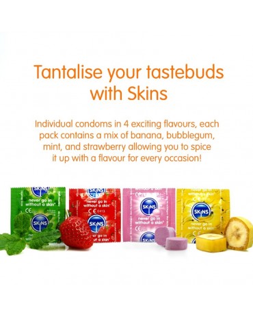 Vi presentiamo la confezione da 8 preservativi Skins Flavor: un39elegante soluzione pronta all39uso che offre fino al 33% di preservativi in più per confezione rispetto al leader di mercato. Questa entusiasmante confezione multipla include quattro invitanti gusti: Banana, Gomma da masticare, Menta e Fragola, offrendo ai consumatori un modo divertente e gustoso per migliorare l39intimità in ogni occasione. Ogni preservativo è confezionato singolarmente e realizzato in lattice naturale di alta qualità, che offre una sensazione naturale, trasparenza e resistenza. Arricchiti con una lubrificazione extra e deliziose fragranze, questi preservativi eliminano il tipico odore di lattice per garantire un39esperienza più piacevole.