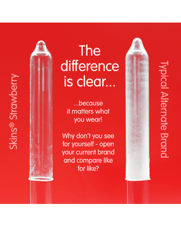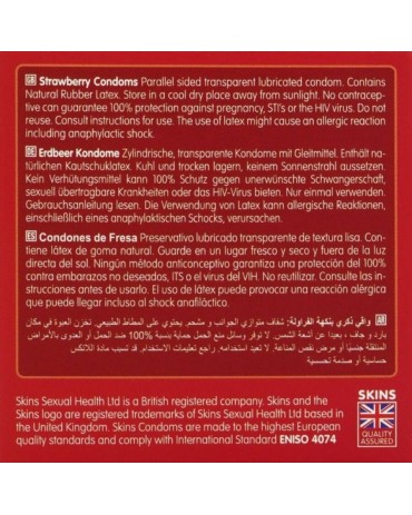 Vi presentiamo la nostra nuova confezione da 4 preservativi alla fragola, caratterizzata da un design elegante e pronto all39uso e fino al 33% di preservativi in più rispetto al leader di mercato. Aggiungete un classico gusto fruttato alla vostra gamma di prodotti con i preservativi Skins alla fragola. Realizzati in lattice naturale di alta qualità per una sensazione di trasparenza e naturalezza, questi preservativi sono progettati per offrire una sensazione di seconda pelle senza compromettere la resistenza o la sicurezza. Ideali per i rivenditori che desiderano offrire un39opzione di gusto popolare e affidabile per una maggiore intimità e protezione.