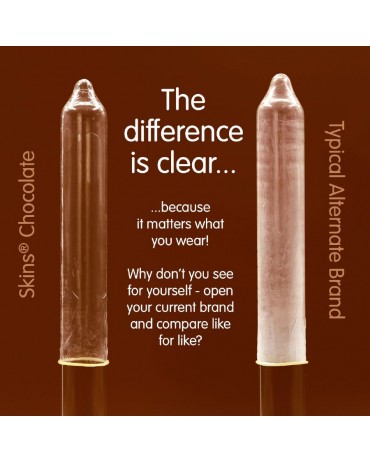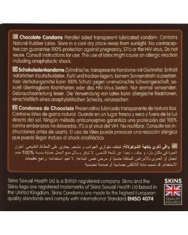 Vi presentiamo la nostra nuova confezione da 4 al gusto di cioccolato, caratterizzata da un design elegante e pronto all39uso e fino al 33% di preservativi in più rispetto al leader di mercato. I preservativi Skins al gusto di cioccolato sono perfetti per chi cerca un prodotto intimo divertente e di alta qualità. Questi preservativi confezionati singolarmente combinano un gusto piacevole con una protezione superiore, rendendoli la scelta ideale per negozi di articoli per adulti, farmacie e negozi di prodotti per il benessere. Questi preservativi Skins sono un ottimo modo per unire due amori: il sesso e il cioccolato. Sono lubrificati e hanno un delizioso aroma di cioccolato davvero invitante, e hanno anche il sapore del cioccolato. Come tutti i preservativi Skins, sono realizzati in lattice di alta qualità, dermatologicamente testato, per offrirti la protezione di cui hai bisogno.