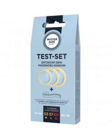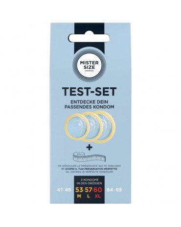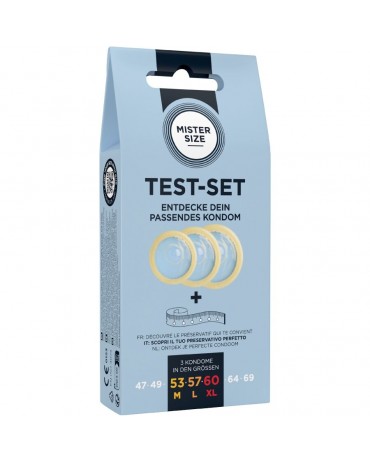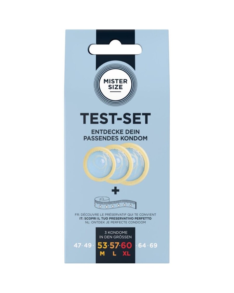 Trova la tua taglia con il kit di prova. Il kit di prova MISTER SIZE , con metro a nastro e confezione di prova media, ti aiuta a scoprire la tua taglia ideale di preservativo. Le misure 53 mm, 57 mm e 60 mm incluse nel kit coprono le misure più comuni. Se utilizzi una taglia diversa, puoi controllarla con il metro a nastro e sentire la differenza con la confezione di prova media.