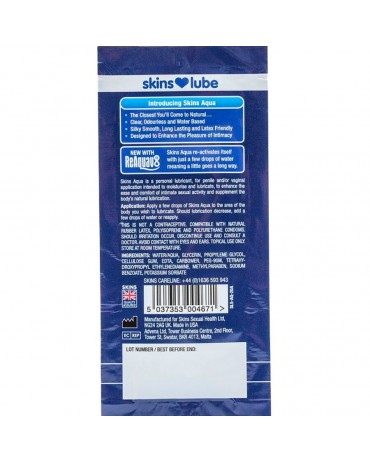 Lubrificanti con cui amerai fare l39amore! Skins Sexual Health è orgogliosa di presentare un sestetto di lubrificanti sensuali di alta qualità, sviluppati con cura per il tuo piacere e la tua soddisfazione. Scivola con qualcuno in modo più confortevole... Lubrificante a base d39acqua dalla sensazione naturale e di lunga durata per un39intimità naturale. Specificamente progettato per aumentare il piacere e il comfort durante l39intimità. Skins Aqua è il lubrificante a base d39acqua dalla sensazione più naturale che troverai. La sua formula di alta qualità è stata approvata come dispositivo medico FDA510K, offrendoti la tranquillità di utilizzare il meglio in assoluto. La cosa più vicina al naturale...
