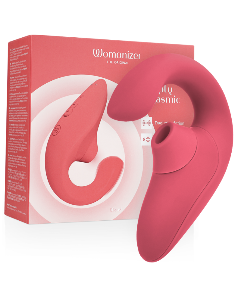 Vibratore Rabbit Pleasure Air. Blend è il vibratore rabbit di Womanizer facile da usare, progettato per una doppia stimolazione orgasmica. Stimolando simultaneamente il punto G con vibrazioni interne e il clitoride con delicate onde Pleasure Air, Womanizer Blend offre un modo semplice per scoprire orgasmi misti. Due motori con controlli indipendenti ti permettono di personalizzare il tuo piacere.