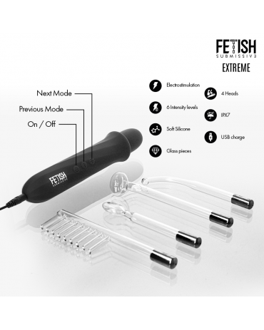 Fabricado con silicona súper suave y materiales seguros para el cuerpo, este dispositivo garantiza una experiencia placentera y confortable. Su diseño elegante incluye piezas de cristal que aportan un toque de lujo y sofisticación, ideal para los amantes del estilo fetish y los juegos de dominación y sumisión. El Fetish Submissive - Vibrador Wand de Electroestimulación incluye cuatro cabezales intercambiables, cada uno diseñado para ofrecer diferentes sensaciones y puntos de contacto. Cambia de textura y forma para explorar nuevas maneras de estimular el cuerpo y descubrir tus límites más placenteros.